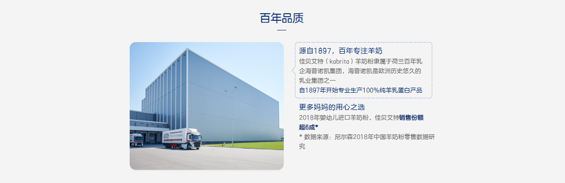 佳貝艾特kabrita,奶粉均源自荷蘭自家牧場,從奶源到罐裝,做到原產(chǎn)原罐,無異地分裝,為寶寶提供原汁原味的荷蘭營養(yǎng)奶源,奶源全程可追溯。2011年,佳貝艾特進入中國市場,開始為中國的寶寶提供幼兒配方奶粉。為了保證奶粉新鮮的品質(zhì),佳貝艾特嚴格堅持歐盟標準,每一步都在荷蘭自家生產(chǎn)線完成,真正做到"原產(chǎn)原罐"。更開啟了奶源追溯的時代,將奶粉"從牧場到罐裝的每一步"搬到了消費者眼前。