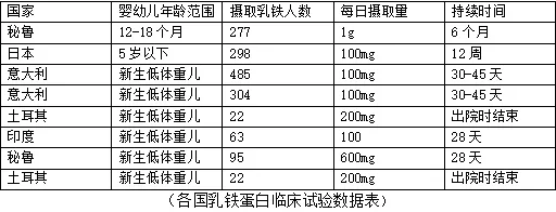 2018年由中華營養(yǎng)學(xué)會婦幼營養(yǎng)分會發(fā)布的《乳鐵蛋白幼兒健康效應(yīng)專家共識》中,源引的各國人體實驗里乳鐵蛋白的每日攝取量超過100mg/天的,未有不良反應(yīng)記錄。具體的參與人數(shù),攝取量及持續(xù)時間,筆者整理出來。