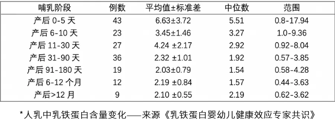 人乳中的乳鐵蛋白在整個泌乳期呈現(xiàn)較為規(guī)律的變化,產(chǎn)后3-6個月,乳鐵蛋白含量逐步保持相對穩(wěn)定,之后,其含量隨母體泌乳時間的延長呈下降趨勢。